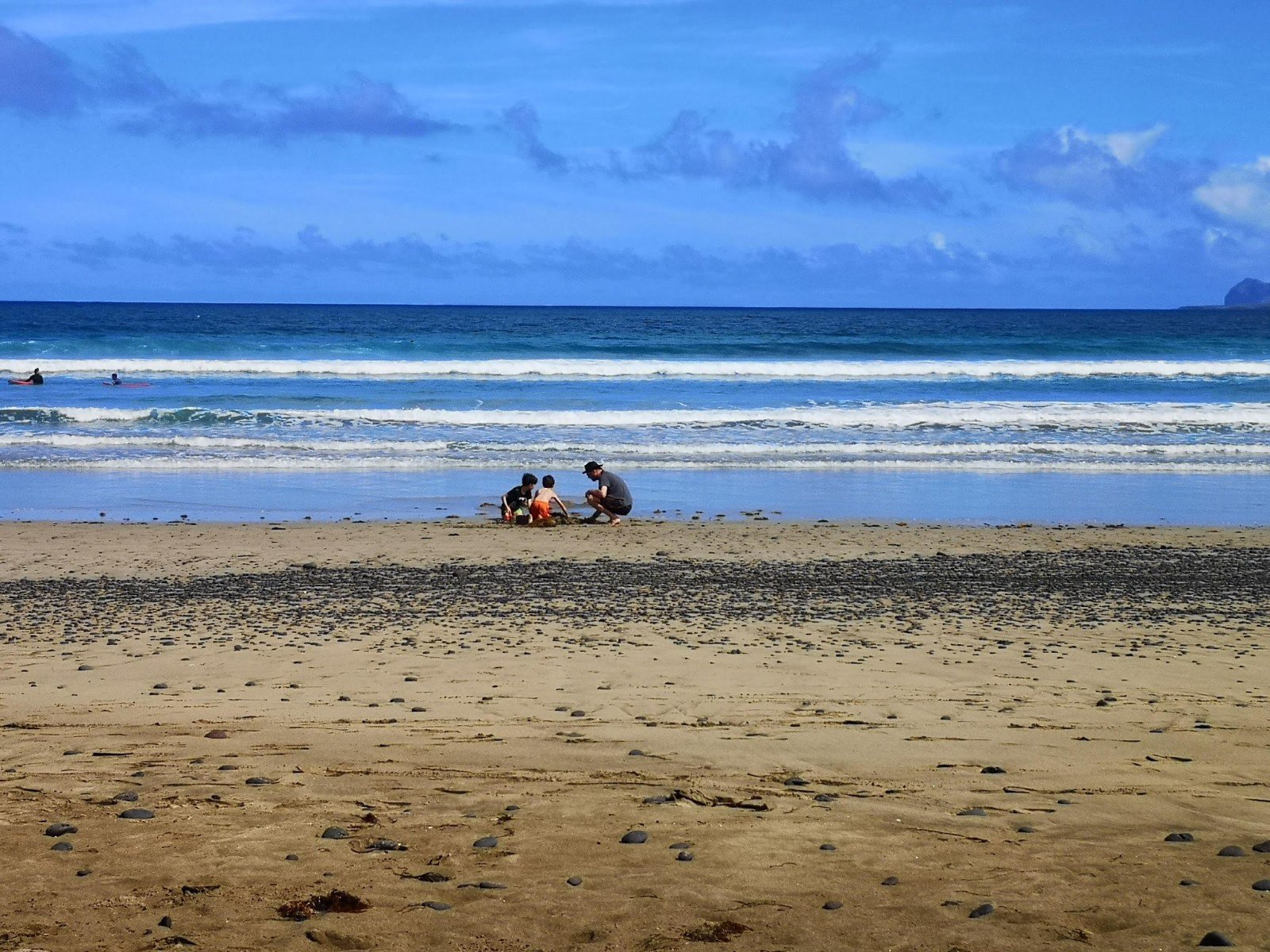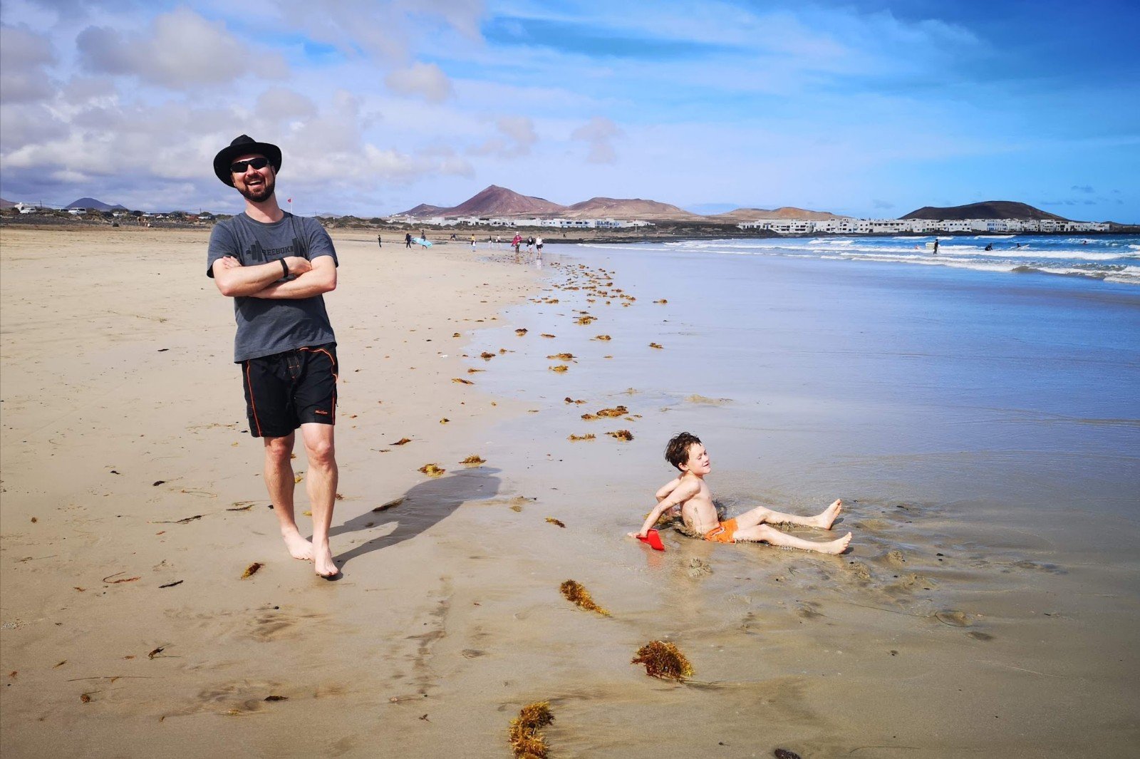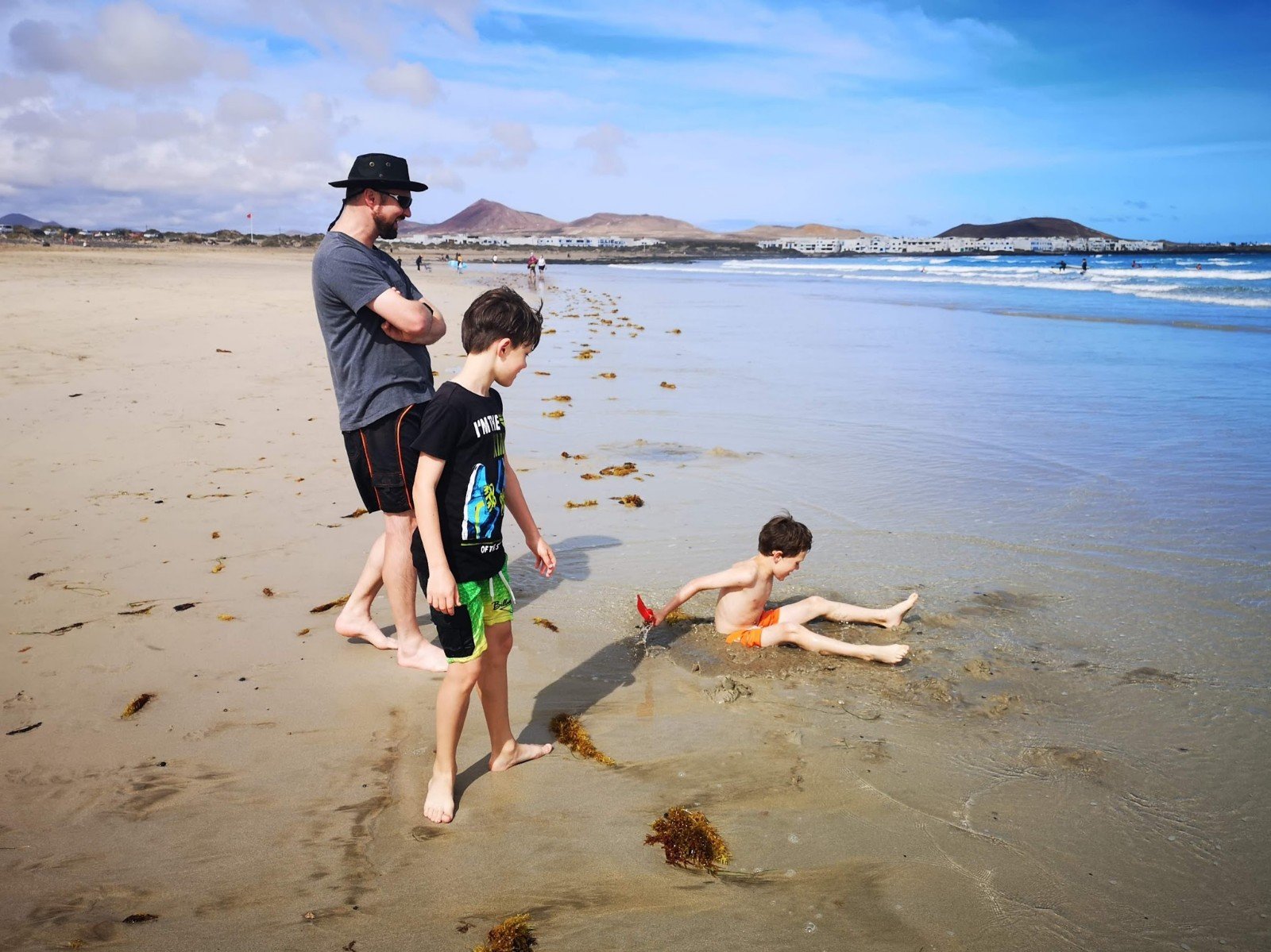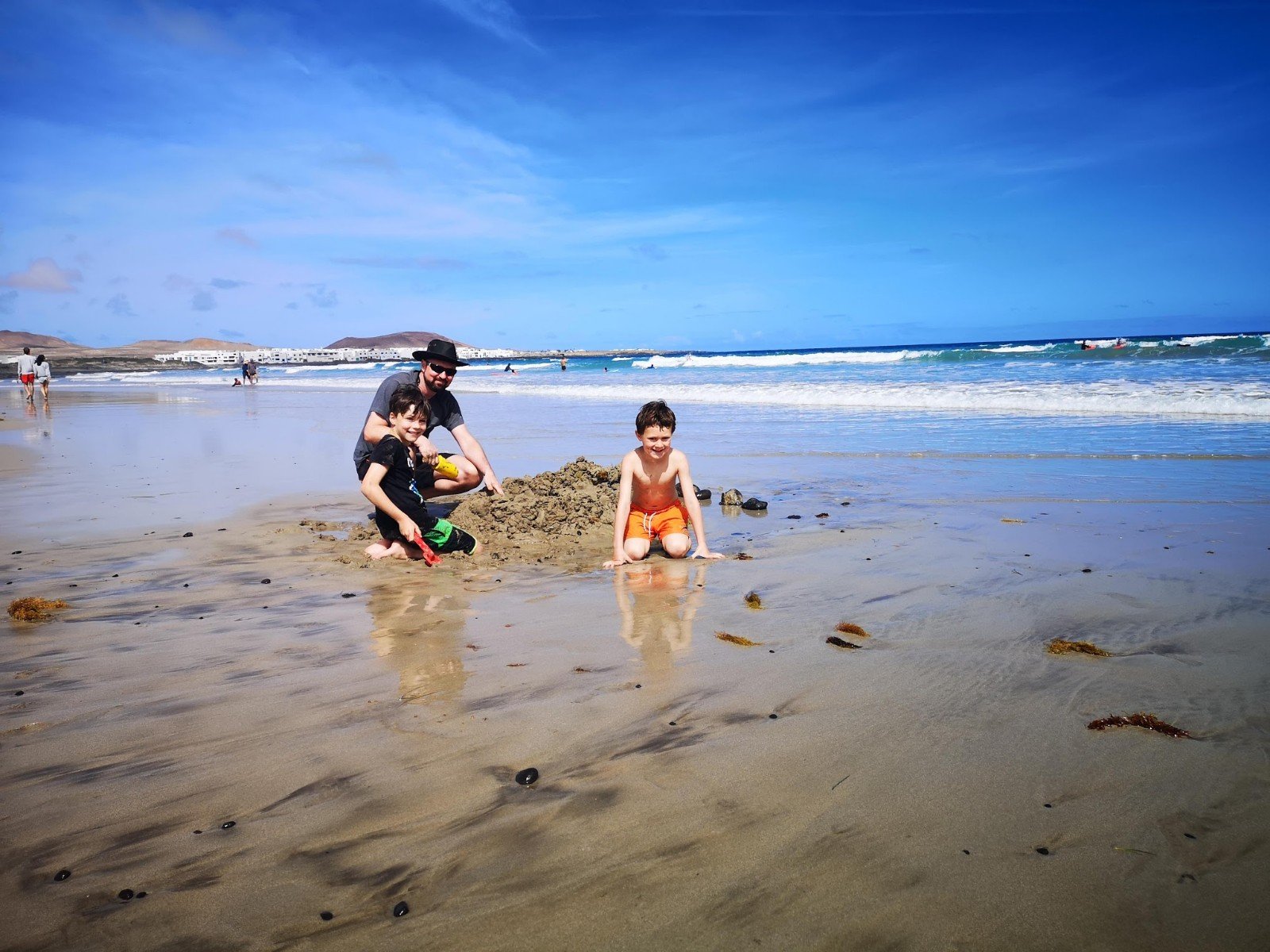 Heute geht’s in Surfers Paradise, ins Biarritz von Lanzarote nach Playa de Famara. Leider sind die Strömungen durch die Wellen so stark, dass mit den roten Flaggen angedeutet wird, dass man nicht im Meer baden darf. Erstaunlicherweise sind aber Dutzende von Surfern auf dem Wasser unterwegs, aber das scheint kein Problem zu sein. Wir gehen dann die Wellen auskundschaften, schnell stellt sich dann heraus dass Sandburgen bauen am Strand noch viel mehr Spaß macht, als in den Wellen zu hüpfen.