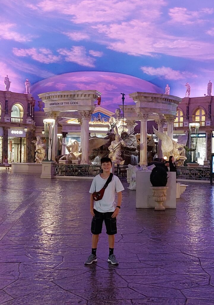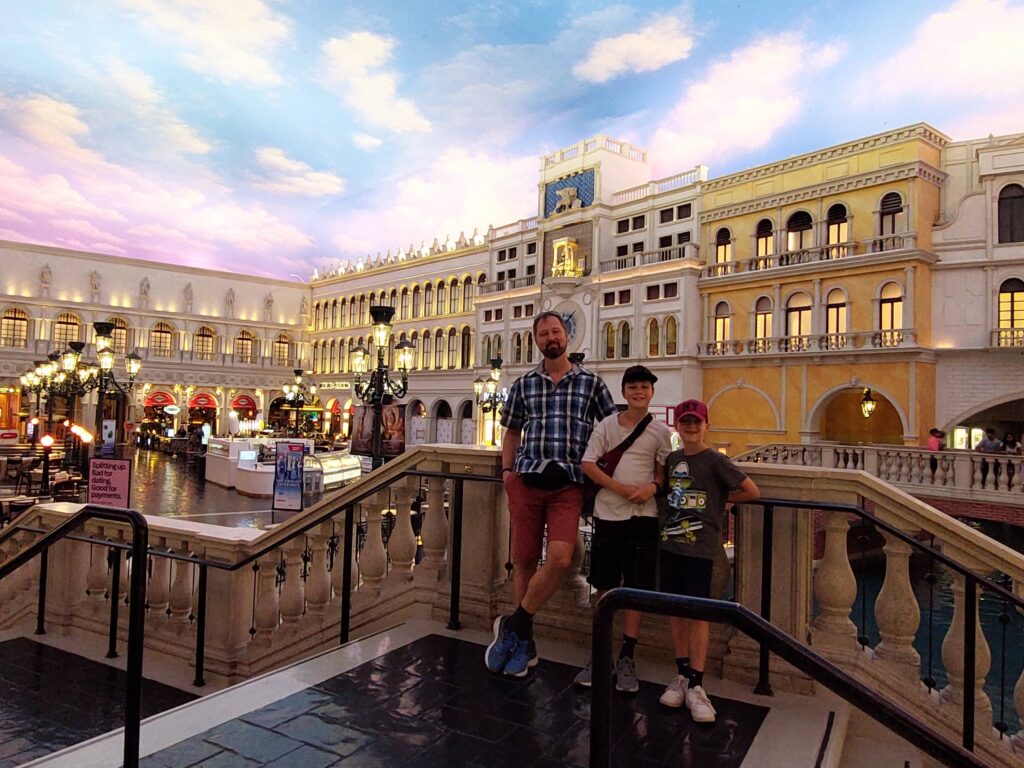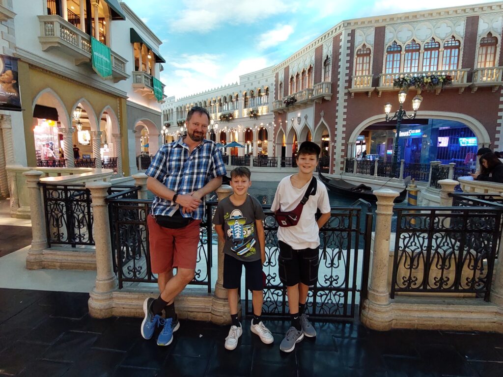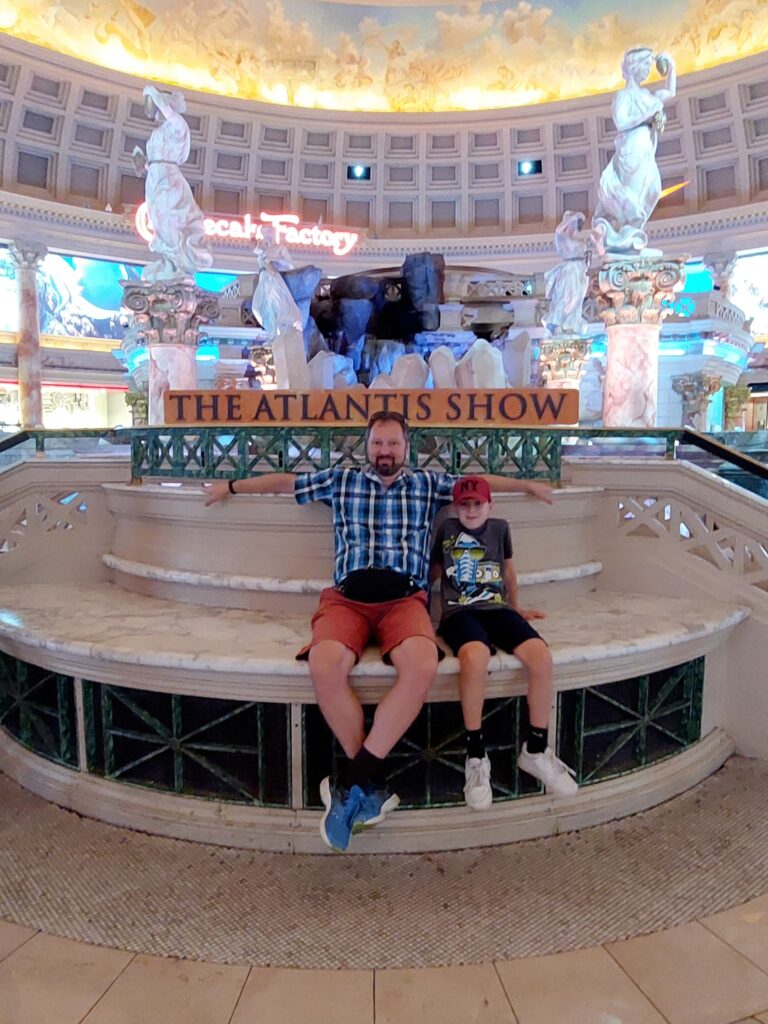 Wir sind eine halbe Stunde zu früh da, was Leon gar nicht verstehen kann. Warum wir so stressen, damit wir dann eine halbe Stunde warten müssen… Tja, wir schauen uns noch das Hotel Mandalay und den Teil mit dem Shark-Reef an. Aber das interessiert nicht alle gleich stark… 😉 Um 18:45 Uhr sind wir bereit, es gibt für die Kids noch eine Tüte Popcorn für Sage und Schreibe 10 USD und wir setzen uns auf die 4 super Plätze, die uns Anji in Reihe 5 besorgt hat.
