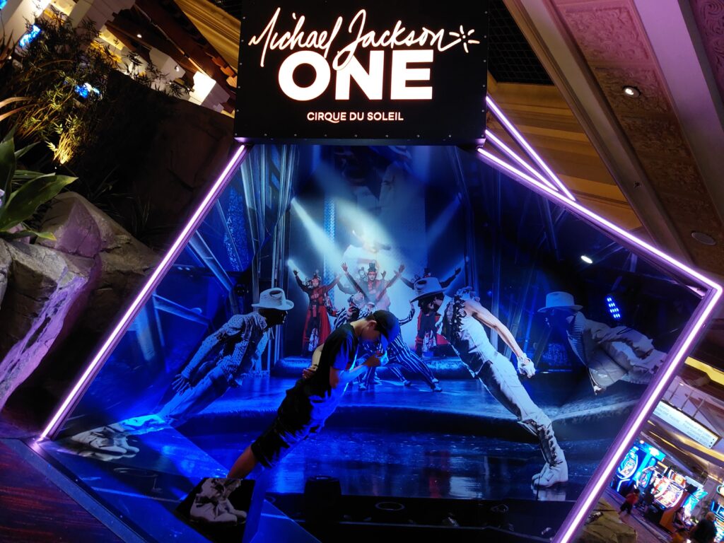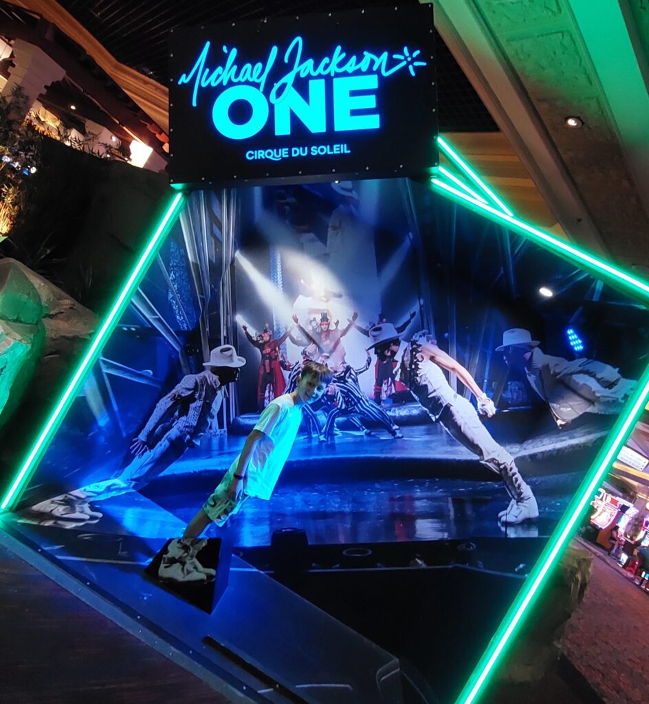 Das alles braucht recht viel Zeit. Damit wir nicht zu spät ins Hotel zurück kommen, müssen wir das Shopping abbrechen, weil wir heute Abend eine ganz besondere Vorstellung mit Jan und Leon besuchen. Die Aufführung: «Michael Jackson ONE by Cirque du Soleil«. Wir nehmen das Taxi zum Hotel Mandalay Bay. Der Chauffeur ist unglaublich unfreundlich, telefoniert die ganze Zeit mit irgendjemandem, hat keine Lust, sich mit uns zu unterhalten. So ne Pfeife. So gibt’s kein Trinkgeld ..