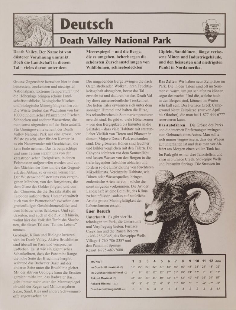 Der tiefste Punkt des Tales liegt 85,95 Meter unter dem Meeresspiegel und ist zugleich die tiefste begehbare Stelle ganz Nordamerikas. Es gibt zwei Haupttäler innerhalb des Parks, das Death Valley und das Panamint Valley. Beide Täler sind wenige Millionen Jahre alt. Das Death Valley ist von mehreren Gebirgen umschlossen, die höchste Gebirgskette bildet die Panamint Range mit dem 3366 m hohen Telescope Peak. 1933 wurde das Death Valley zum National Monument ernannt. 1994 wurde es, stark erweitert, zum Nationalpark aufgewertet. Hierzu zählt auch Devils Hole als kleine Exklave weiter östlich in Nevada, im Schutzgebiet Ash Meadows National Wildlife Refuge gelegen.