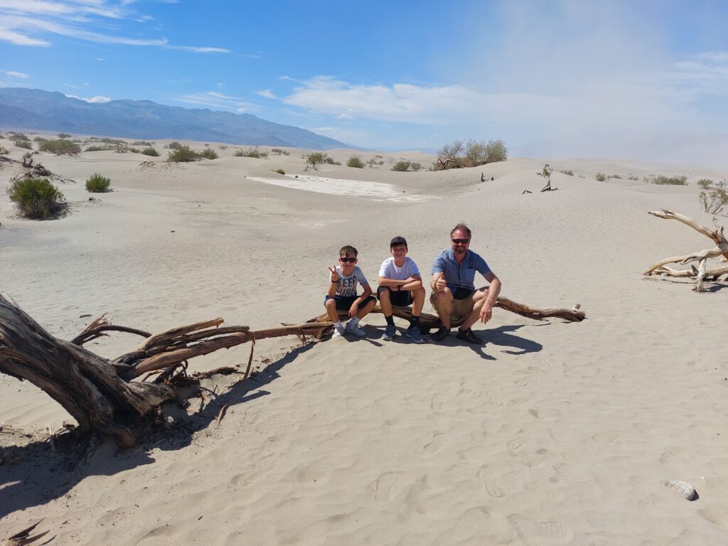 Wir verlassen das Basin und essen beim Furnace Creek in einem alten Saloon bei heruntergekühlten 22 Grad was Kleines und weiter geht es zu den Sanddünen der Mesquite Ebene. Hier geraten wir in einen regelrechten Sandsturm. Die Dünen entstehen, weil starke Fallwinde den Sand aus den kiesbedeckten Hängen herausblasen. Dabei wird der Sand am Fuss des Hanges als Dünen abgelagert.