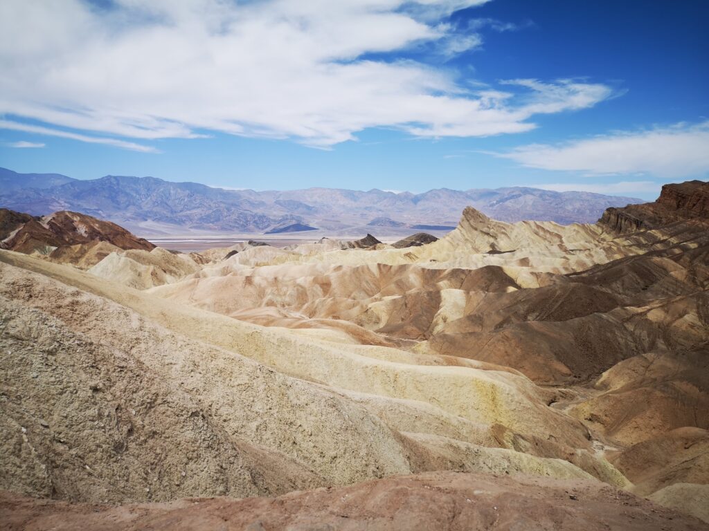 Den ersten Halt machen wir auf dem Dante’s View mit Blick ins Bad Water Basin. Das ist der Teil des Death Valleys, in den alle Flüsse münden und verdunsten. Deshalb handelt es sich eigentlich die meiste Zeit des Jahres um einen Salzsee. Im Moment fließt natürlich kein Fluss, aber im Winter hat es hier durchaus Wasser.