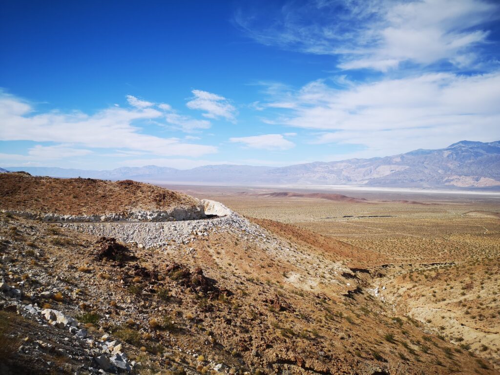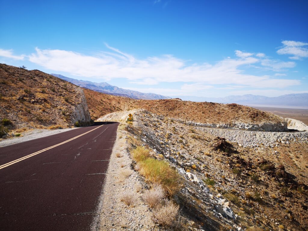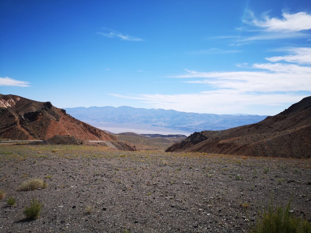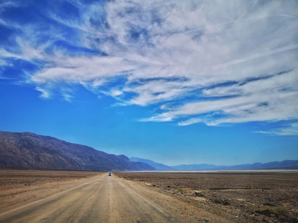 Die USA sind einfach riesig. Das merken wir heute beim Durchqueren des Death Valley Nationalparks. Auf der Karte sieht es nicht so aus, aber in der Realität sind die Distanzen enorm. Bei pfeilgeraden Strassen, sieht man bis zum Horizont übrigens rund 6 Meilen weit.