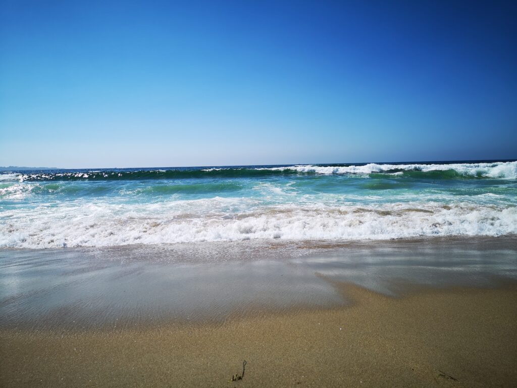 Als wir dann endlich beim Hotel ankommen, ist es schon 15:30 Uhr. Dann gehen wir noch ins Meer, das sehr kalt ist und viele Wellen hat. Leon und ich bauen Sandburgen und gehen hüfttief ins Wasser. Papi kommt auch mit, Mami ist es zu kalt.