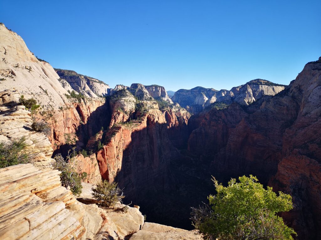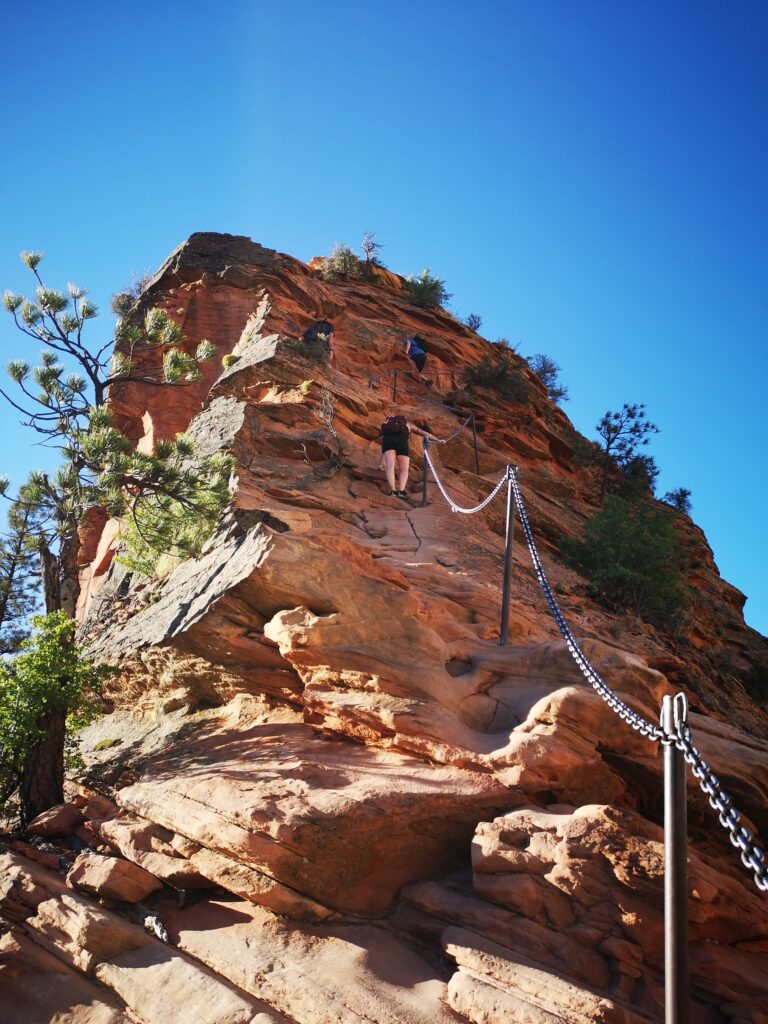 Vor unserer Abreise irgendwann im April oder im Mai haben wir an einer Verlosungen teilgenommen, damit wir eine oder mehrere der spannenden Wanderungen im Zion-Nationalpark machen dürfen. Wir haben beim Angel’s Landing gewonnen und dürfen darum in der ersten Besuchergruppe am Morgen auf den Berg hoch wandern. Die Bewilligungen werden kontrolliert, auch dafür, dass nicht zu viele Besucher gleichzeitig zum Engellandeplatz unterwegs sind. Die Wanderung ist streng, steil und gefährlich, da an gewissen Stellen der Weg links und rechts praktisch senkrecht abfällt. Dieses Jahr ist noch niemand hier verunfallt, soll aber regelmässig passieren. 😳