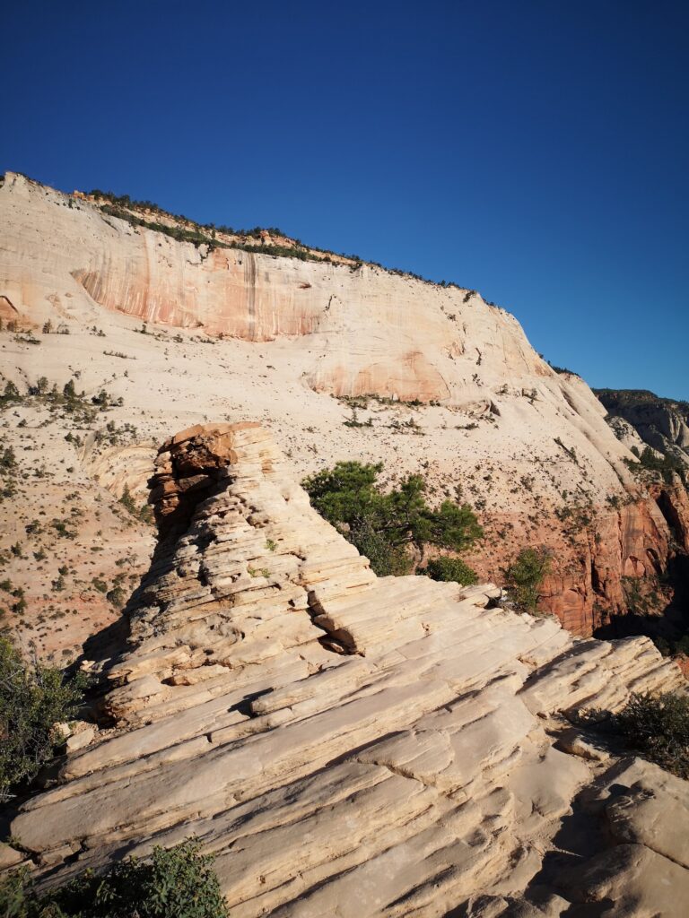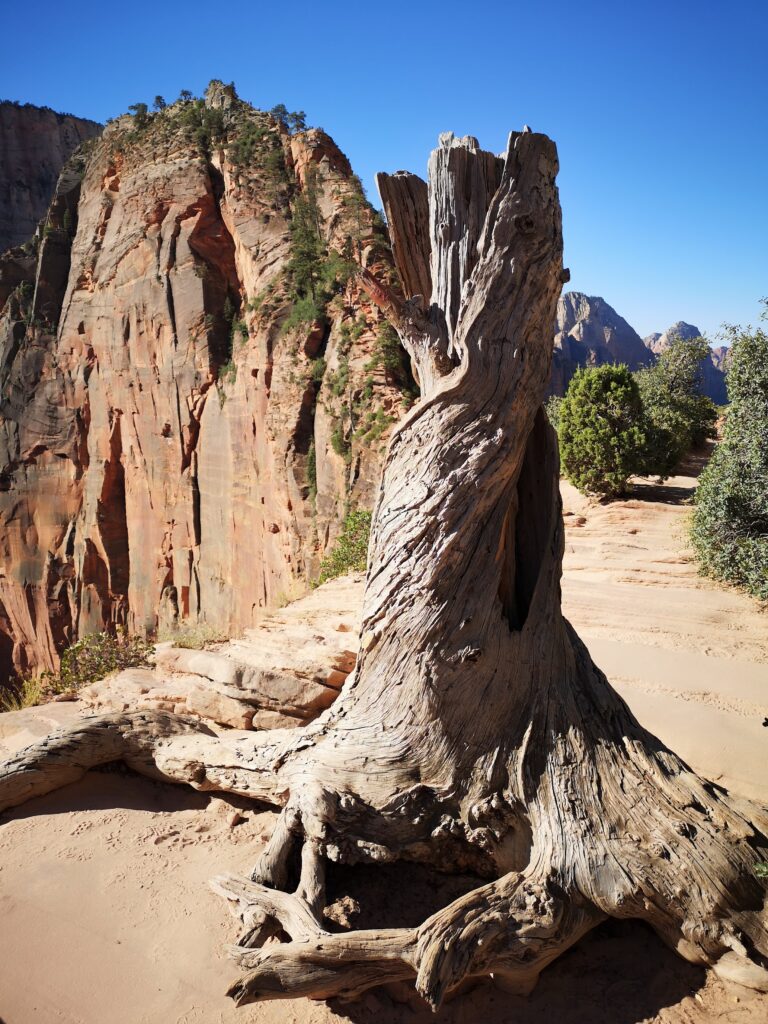 Wir laufen zusammen mit circa weiteren 30 Personen los, queren den Virgin River über eine Brücke und wandern in Richtung Angels Landing. Der Weg ist zuerst flach und steigt dann immer mehr an, bis man über Serpentinen eine senkrechte Felswand überwindet. Dann geht es ein paar hundert Meter in ein schmales Tal hinein, bevor dann ein weiterer steiler Anstieg mit 21 Serpentinen überwunden werden muss.