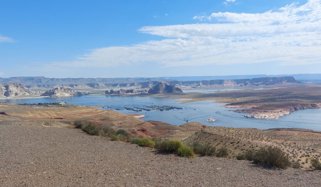 Die anschliessende Fahrt nach Arizona zum Lake Powell ist ein Pappenstiel. Mit 65 mph brausen wir in Richtung Page. Kurz nach der Überquerung der Grenze nach Arizona stellen wir die Uhren eine Stunde zurück und fahren zum Aussichtspunkt Wahweap, von dem aus man über den Lake Powell und auf den Glen-Canyon-Damm sieht.