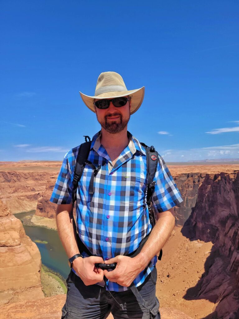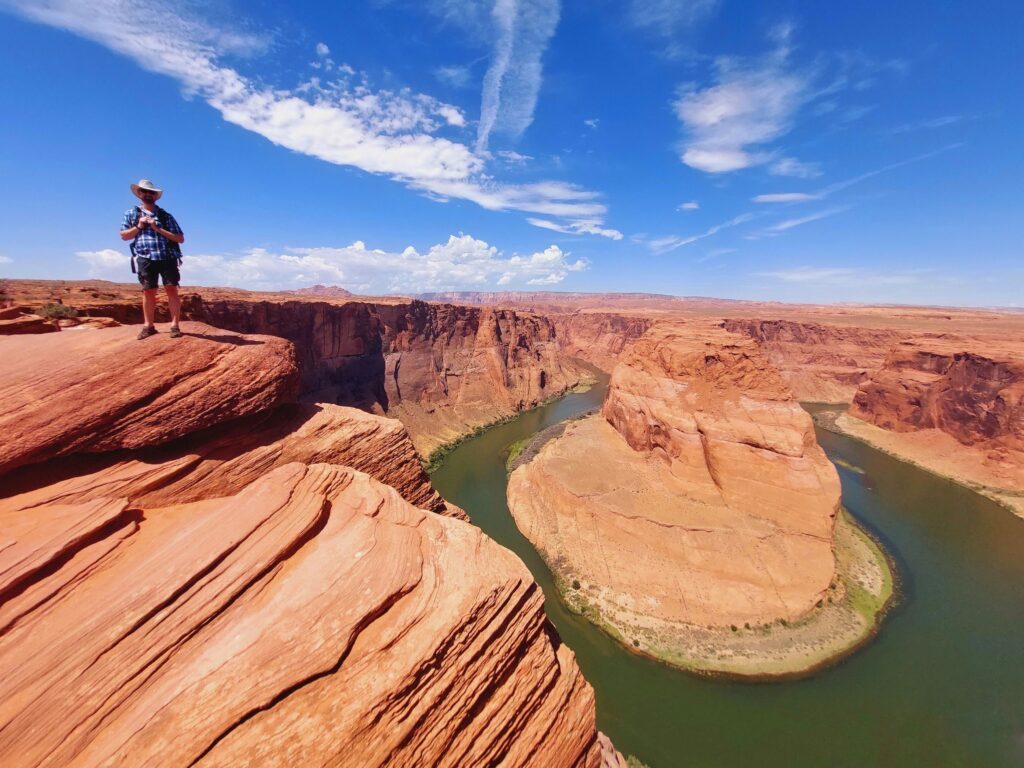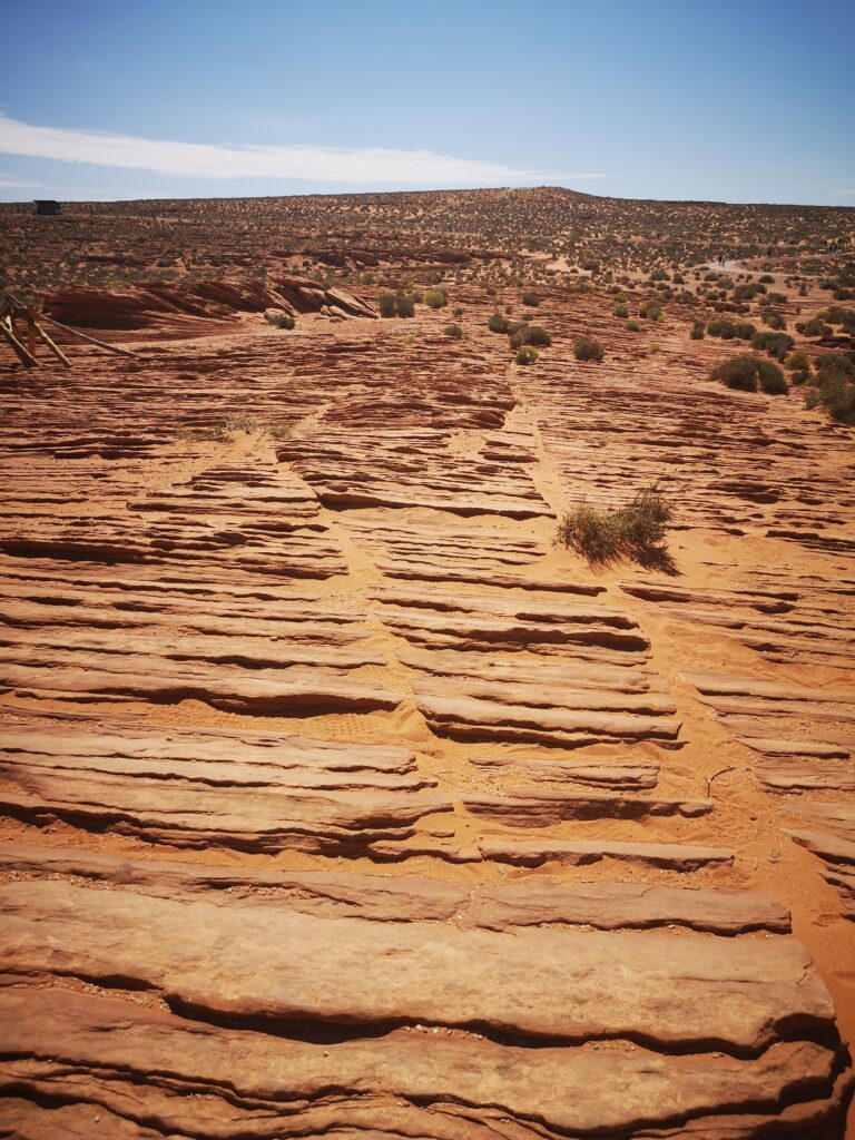 Die Temperaturen hier unten auf 1500 m.ü.M, also rund 1000 Meter tiefer als beim Bryce Canyon, sind deutlich höher: 106 °F, also rund 41 °C. Es ist bewölkt. Wenn die Sonne hinter den Wolken verschwindet, hat man das Gefühl, dass die Heizung abgedreht wurde. Kommt die Sonne wieder hinter den Wolken hervor, spürt man die Strahlung deutlich und man meint, die Heizung sei wieder eingeschaltet. Auf jeden Fall wären die 41° C ohne direkte Sonnenstrahlung deutlich angenehmer. Wir bzw. Jan und Leon merken das auf dem anschliessenden Spaziergang zum Horseshoe-Bend, dem hufeisenförmigen Mäander des Colorados. Das Gelände ist gut abgegrenzt, man muss 10 Dollar Parkgebühren bezahlen, wenn man die Attraktion besichtigen möchte. Das ist das erste Mal, das wir fürs Parken bezahlen müssen. Wir sind 4 unter vielen hunderten, die dieselbe Idee hatten. Es ist drückend heiss und wir schmieren und natürlich mit Sonnencrème ein. Einige haben das besser im Griff als andere: