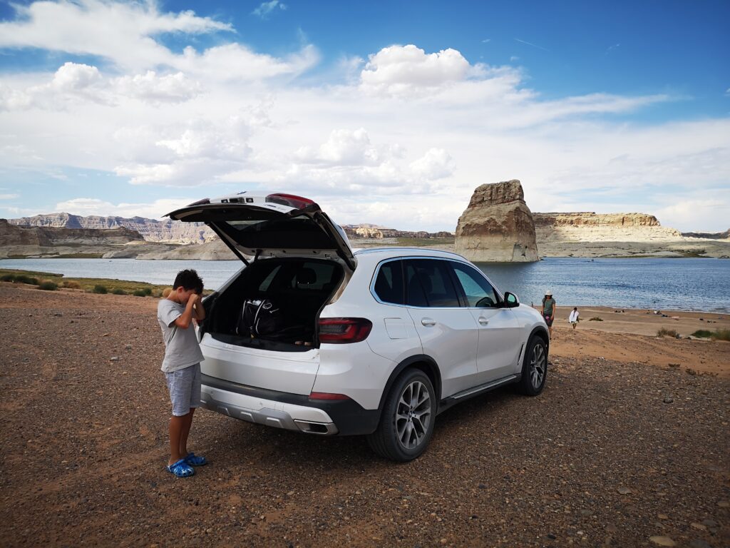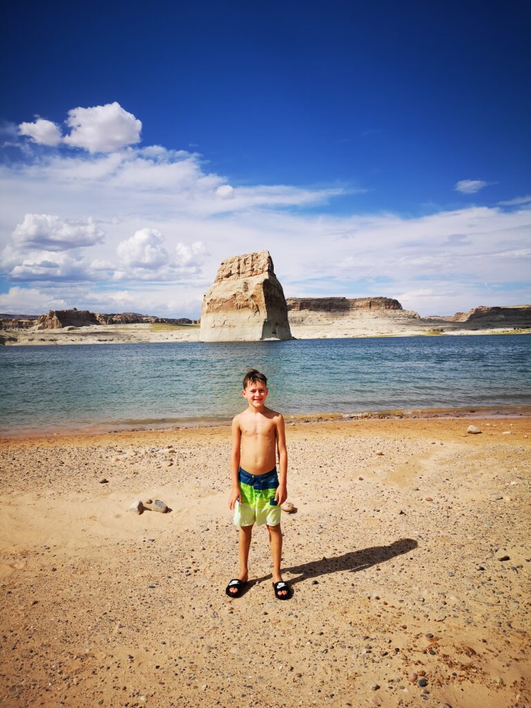 Als wir dann alle wieder fit sind, entscheiden wir uns für eine Abkühlung im Lake Powell beim Lone Rock Beach. Warum der Strand so heisst, wird klar, wenn man die Fotos 1 und 4 unten sieht. Der Lone Rock Beach liegt noch in Utah, wir müssen also nochmals zurück und die Uhren nochmals eine Stunde vorstellen… 🤔 Auf der Arizona Seite gibt es keinen vernünftigen Seezugang zum Baden. Das beste ist, man darf hier im Utah mit dem Auto an den Strand fahren. Natürlich auf eigene Verantwortung. Wir fahren so weit wir uns trauen ohne stecken zu bleiben, parken oberhalb der Sanddüne und springen ins kühle Nass. Andere fahren über die Sanddüne bis zum Wasser nach unten.